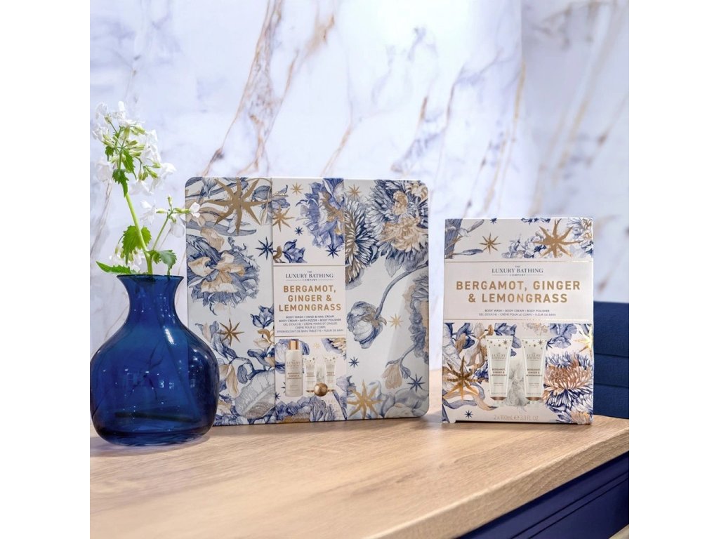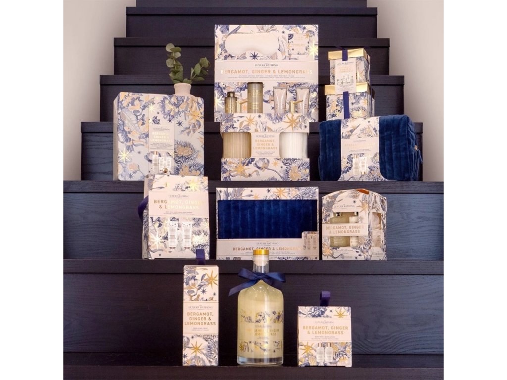 Kolekce Bergamot, Ginger & Lemongrass propojuje vytříbený britský design s jemnými svátečními prvky ve zlatých, modrých a krémových tónech.