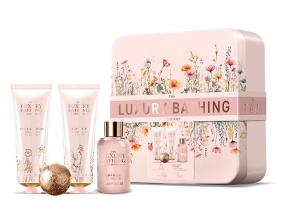 Luxusní dárková sada s vůní pivoňky, broskví a malin v elegantní plechové dóze. Obsahuje sprchový gel, tělový krém, krém na ruce a šumivou kouli do koupele pro dokonalý...