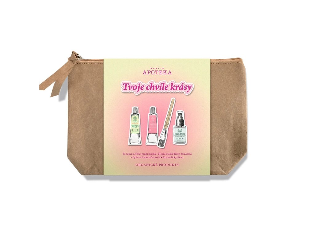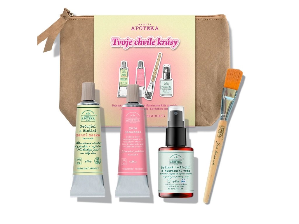 Dárková sada Tvoje chvíle krásy je dokonalou volbou pro ženy, které chtějí mít kompletní péči o pleť v jednom balíčku. Spojuje ranní masku, noční masku s růží damašskou, bylinnou hydratační vodu a kosmetický štětec. Je ideální jako dárek k narozeninám, Vánocům nebo jen tak pro radost. Díky přírodnímu složení a oblíbeným produktům Havlíkovy Apotéky se stane oblíbenou součástí každodenního rituálu krásy.