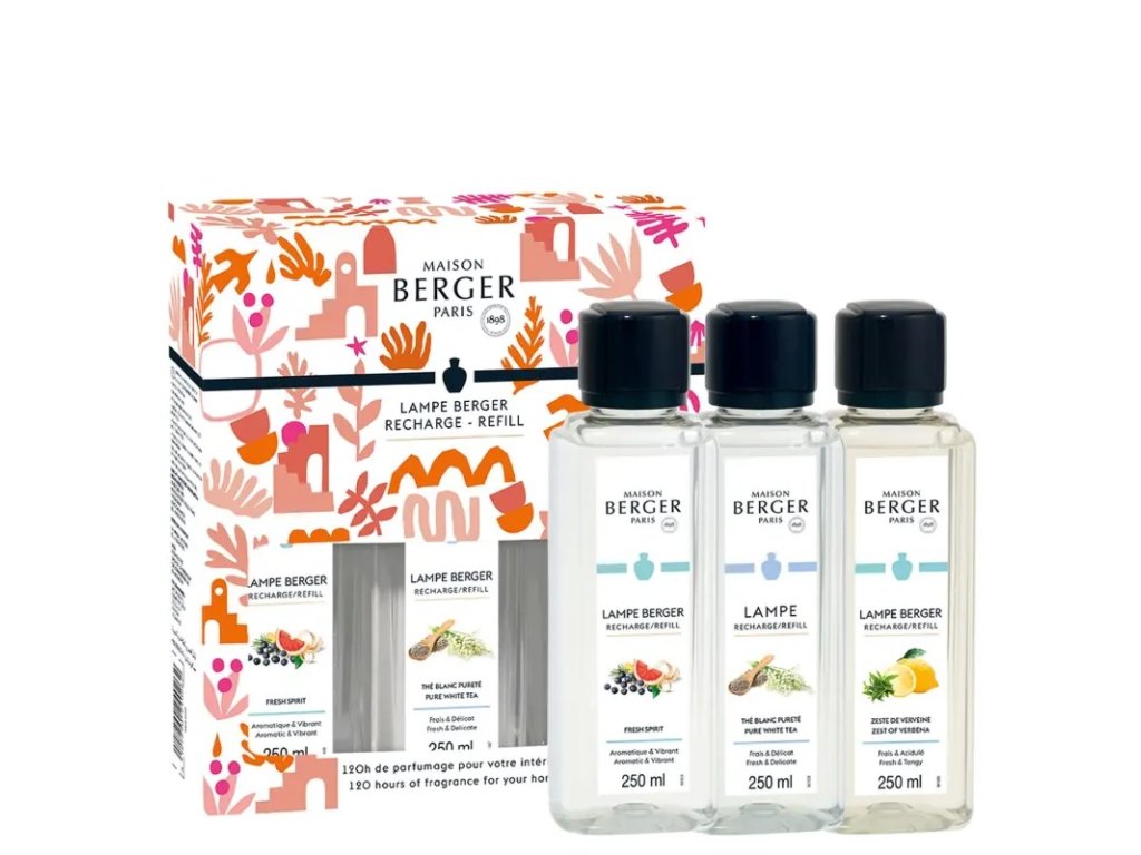 Objevte svěžest a lehkost léta s exkluzivní sadou Triopack Estival od Maison Berger Paris. Tři interiérové parfémy – Fresh Spirit, Zest of Verbena a Pure White Tea – vám umožní každý den vytvořit jinou atmosféru, od jiskřivé energie přes citrusovou vitalitu až po jemnou eleganci. Každá náplň nejen provoní interiér, ale zároveň čistí vzduch díky patentovanému katalytickému systému.