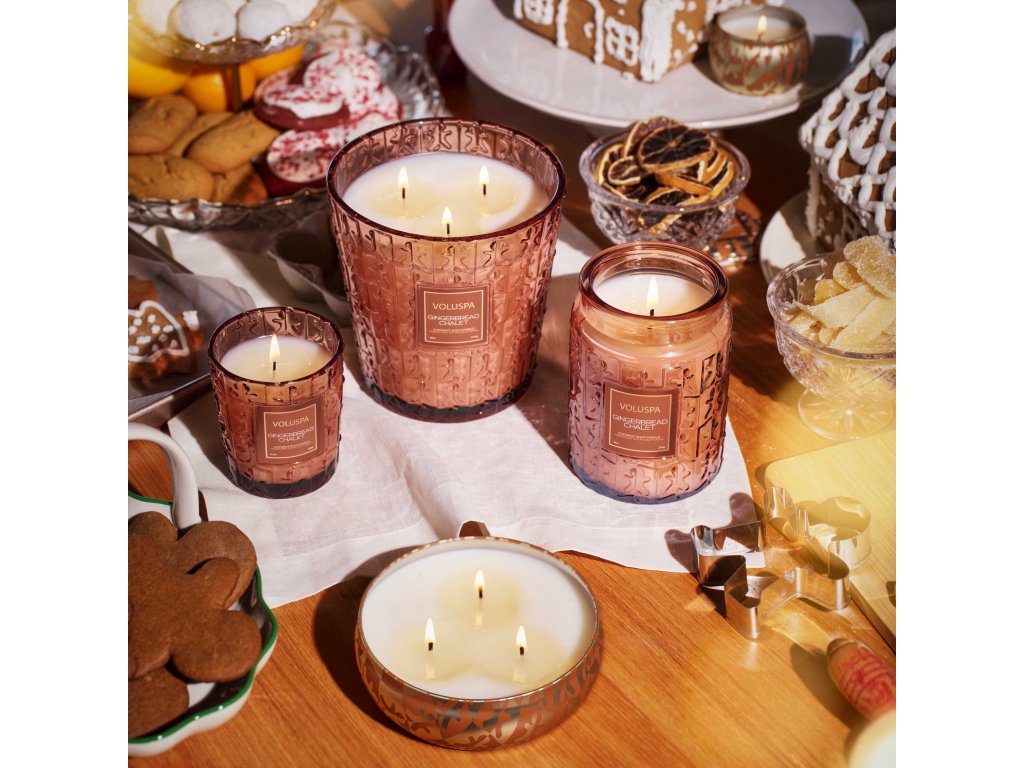 Jedinečná kokosová vosková směs Voluspa je ručně nalévána do velké skleněné dózy zdobené výrazným embosovaným vzorem perníčků – design je sváteční, hravý a zároveň luxusní.