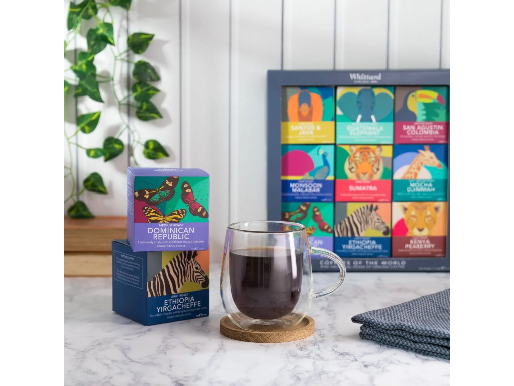 Objevte svět výběrové kávy v té nejpestřejší podobě. Whittard – Dárková sada 9 druhů kávy Coffees of the World propojuje to nejlepší z kávových oblastí Brazílie, Guatemaly, Etiopie, Kolumbie, Indonésie, Indie a Dominikánské republiky. 9 pečlivě vybraných 100% Arabica káv nabízí jedinečný degustační zážitek – od bohatých, čokoládových tmavých pražení až po jemná, svěží a ovocná světlá pražení.